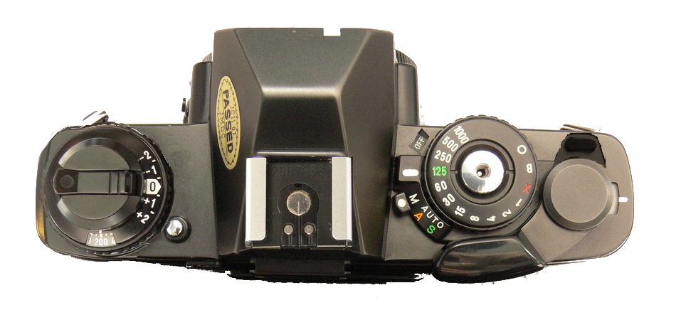 - Viewfinder information (S/A meter right, judas windows for time and aperture bottom, split image/microprism center)